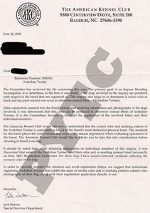 This turned out to be a very lengthy and costly process to Mrs. Lipman (Nikko's Kennels), as AKC shut down her kennel in 1999 for 18 months to conduct DNA studies of 42 litters, sires, and dams. She was not allowed to breed, sell, or conduct any business during this time. Three of the dogs tested were owned by Mrs. Bogren (Crownridge), and one owned by Mrs. Gesmundo (Summit Yorkies). During this study AKC also spoke to several other breeders about off colored pups born in other bloodlines.